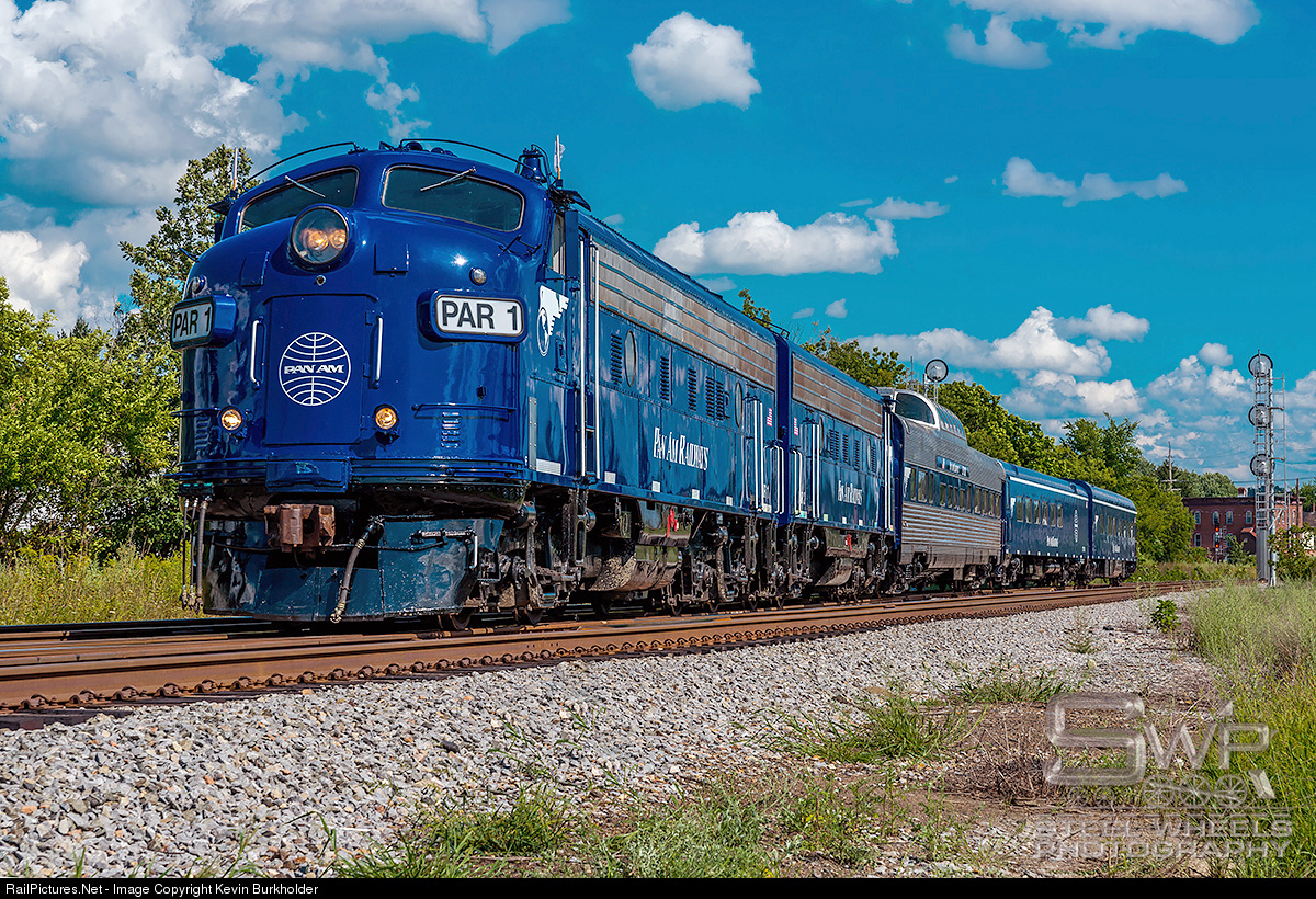 From the ground level - Pan Am Railway's OCS-18 is seen passing from Pan Am Railway rails onto the Canadian Pacific Railway Freight Main Line at Mechanicville, NY with PAR FP9As PAR-1 and PAR-2 leading the now 3-car train - debuting the completed ex-Wabash dome, ST 102!