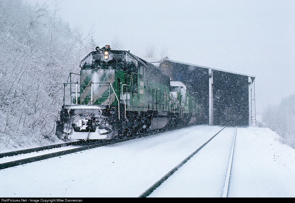 | After climbing over Marias Pass in a wet snow, a westbound Burlington Northern freight pops out of Shed 10.7 at Java, Montana, on March 3, 1988. |