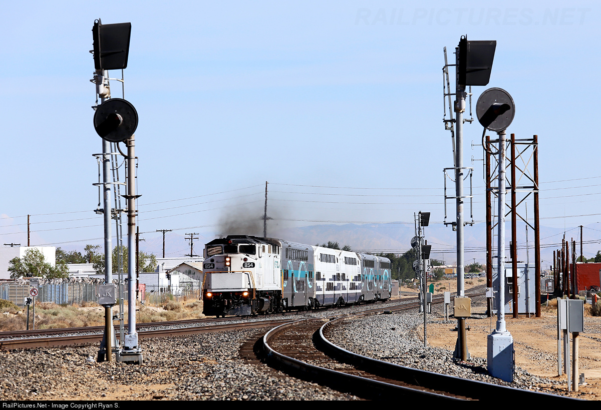 As Metrolink F59PH 854 accelerates out of Palmdale, ready to make a run up Vincent Grade, the searchlights at Palmdale Junction on Union Pacific's Mojave Subdivision observe in silence. Their days numbered the old US&S searchlights at Palmdale Junction continue to perform the job in which they were intended, protecting the junction between the Palmdale-Colton cutoff and the connector to Metrolink's Valley Sub, formerly Southern Pacific's Saugus Line to Los Angeles.