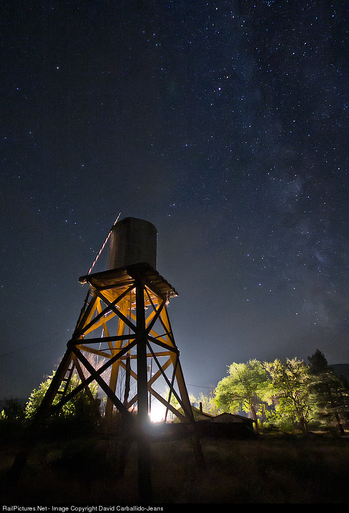 The sounds of GE locomotives slowly grinding up the grade grow louder and louder on a warm August night in Valentine, AZ. Soon, the headlights of an eastbound train appear and illuminate a silhouette outline of the old water tower that used to serve the Crozier Depot with water.