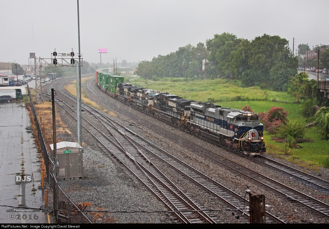 Norfolk Southern's Wabash heritage SD70ACe NÂș1070 leads 230 into the soaked metropolis of Atlanta, Georgia as it approaches Spring Interlocking during a summer downpour.