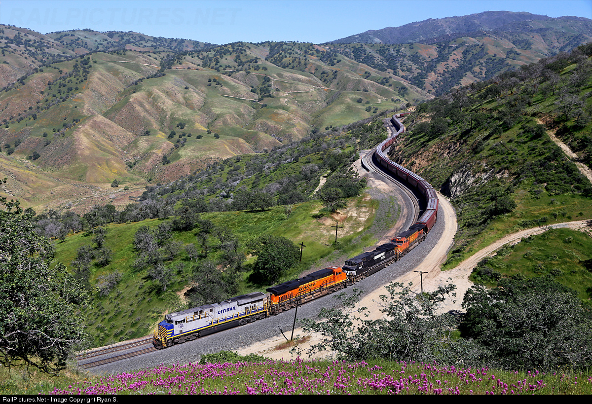 With Tehachapi's rolling hills still clinging to the colors of Spring a westbound loaded grain train carefully drops through Cliff on the western slope of the Tehachapi Range. Nestled down in the valley below is the Tehachapi Creek which the railroad will cross just prior to entering Caliente, some 6 rail miles away and 700' below. Leased CitiRail (CREX) ES44AC #1206 has command of the westbound 'earthworm', 1206 is one of one hundred CREX units currently on lease to the BNSF.