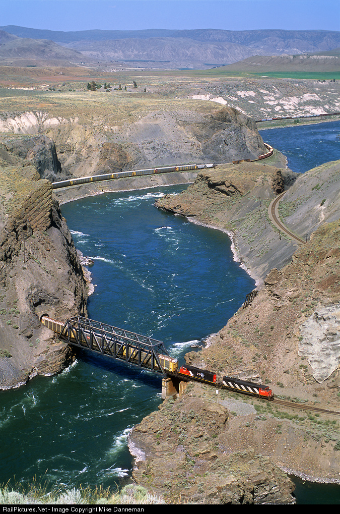 Led by a pair of EMDs—SD60F No. 5546 and SD40-2W No. 5358— a westbound Canadian National freight crosses the Thompson River in scenic Black Canyon west of Ashcroft, British Columbia, on June 25, 2006.