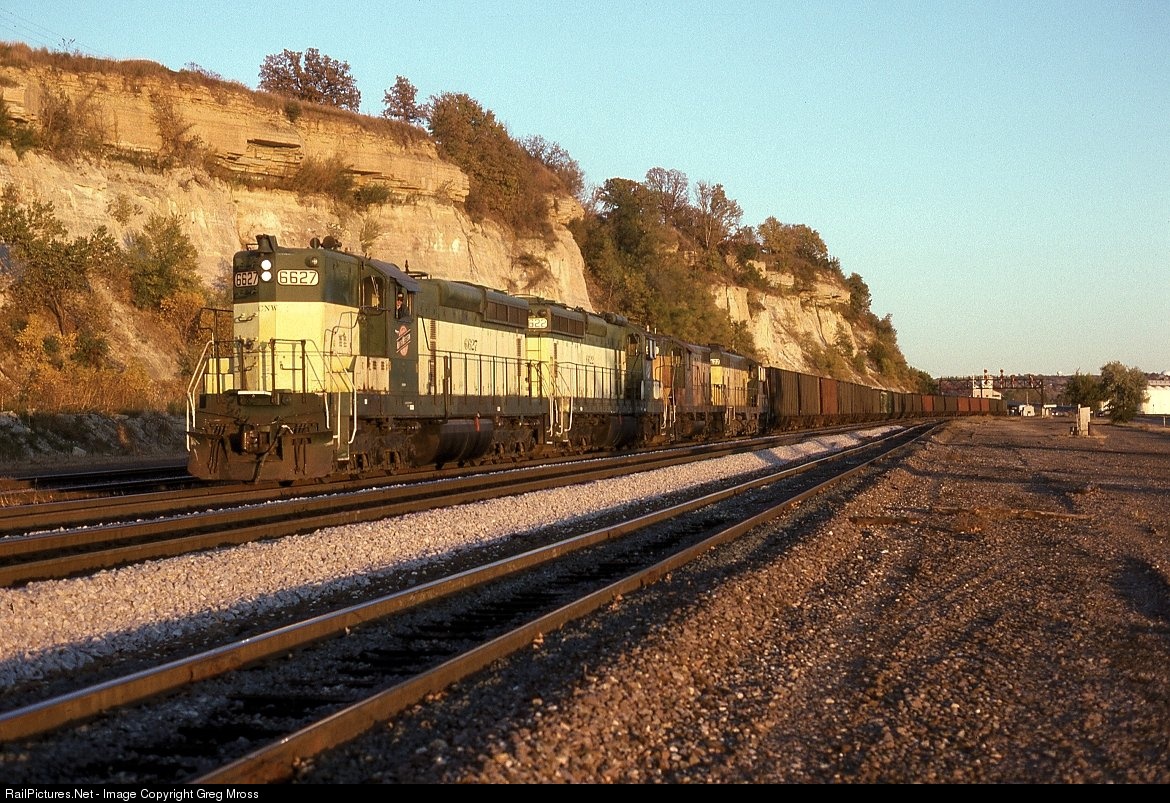 CNW's SD18 were among my favorite locomotives, purchased late in their careers. Here, 6627 (ex-Sou 6309). has a coal train in tow as it rolls along the bluffs of the mighty Mississippi.