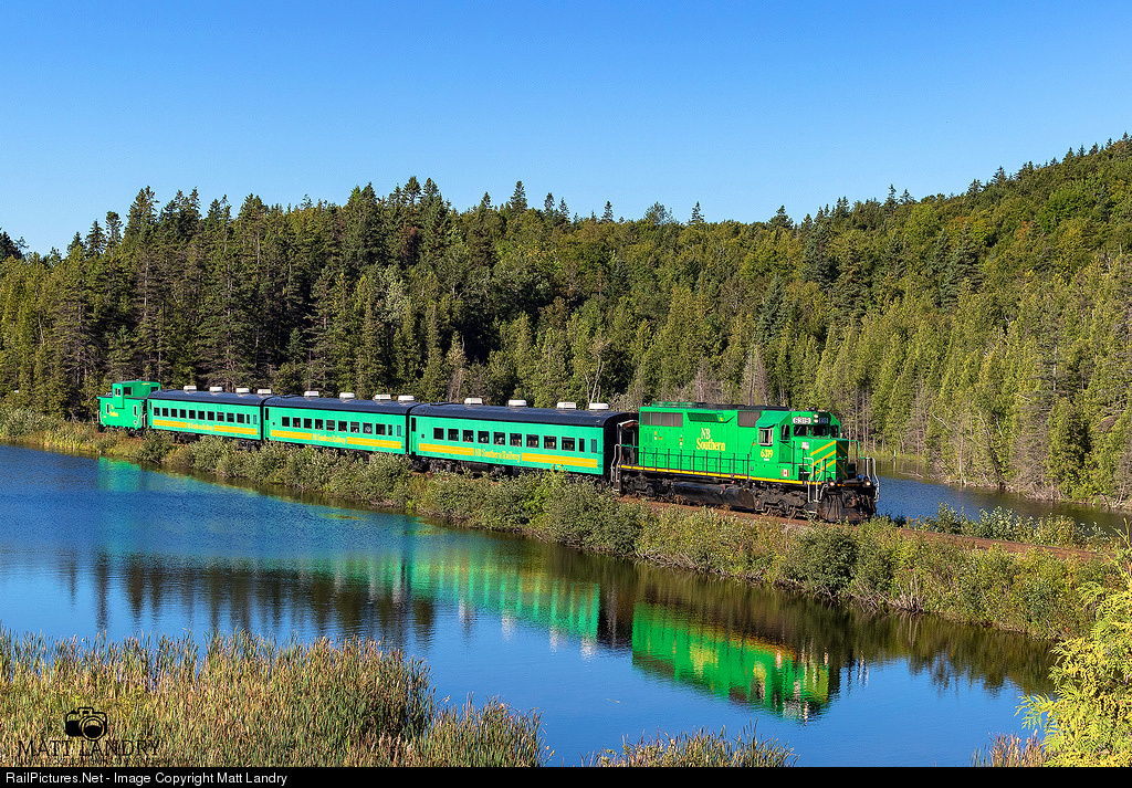 NBSR 6319 leads a passenger train along the CN Sussex Sub towards Renforth, New Brunswick, for the Dragon Boat Festival. They make three trips from Harbour Station in Saint John to Renforth, then make three trips in the afternoon to pick up passengers to head back to Saint John. Seen here, passing by the "unnamed lake". True story.