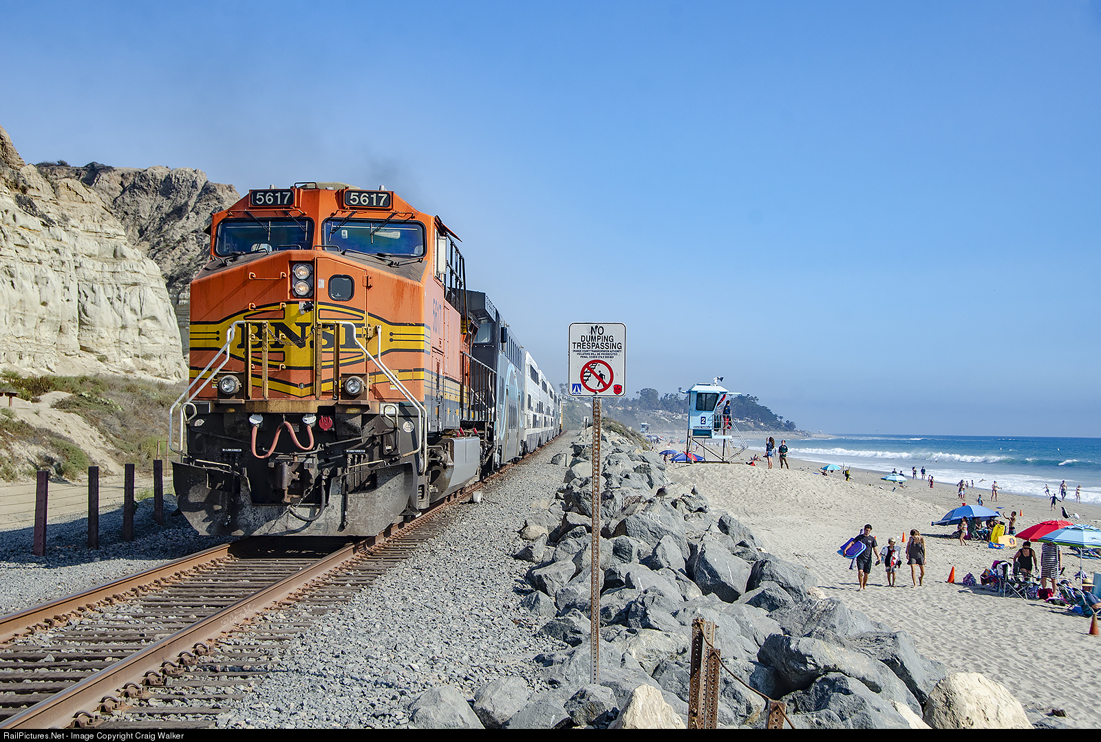 Metrolink train #664, weekend service between Los Angeles and Oceanside, is running about an hour late on August 21, 2016, due to switch problems a few miles to the north. Cruising along the beach in San Clemente, the train is still about 25 miles away from its final stop. Metrolink F59PHI 876 is on the point, and BNSF Railway AC4400CW 5617 is shoving on the rear. A long way from the coal trains it used to pull, 5617 is one of a few dozen BNSF GE diesels on lease to Metrolink as protection while the carrier's Korean-built cab cars have defective pilots repaired. "Trestles," the world-class surfing spot mentioned in the Beach Boys' "Surfin' U.S.A.," is just around the piece of land jutting out into the ocean in the distance - and named for the railroad's trestle across a creek that empties into the Pacific there!