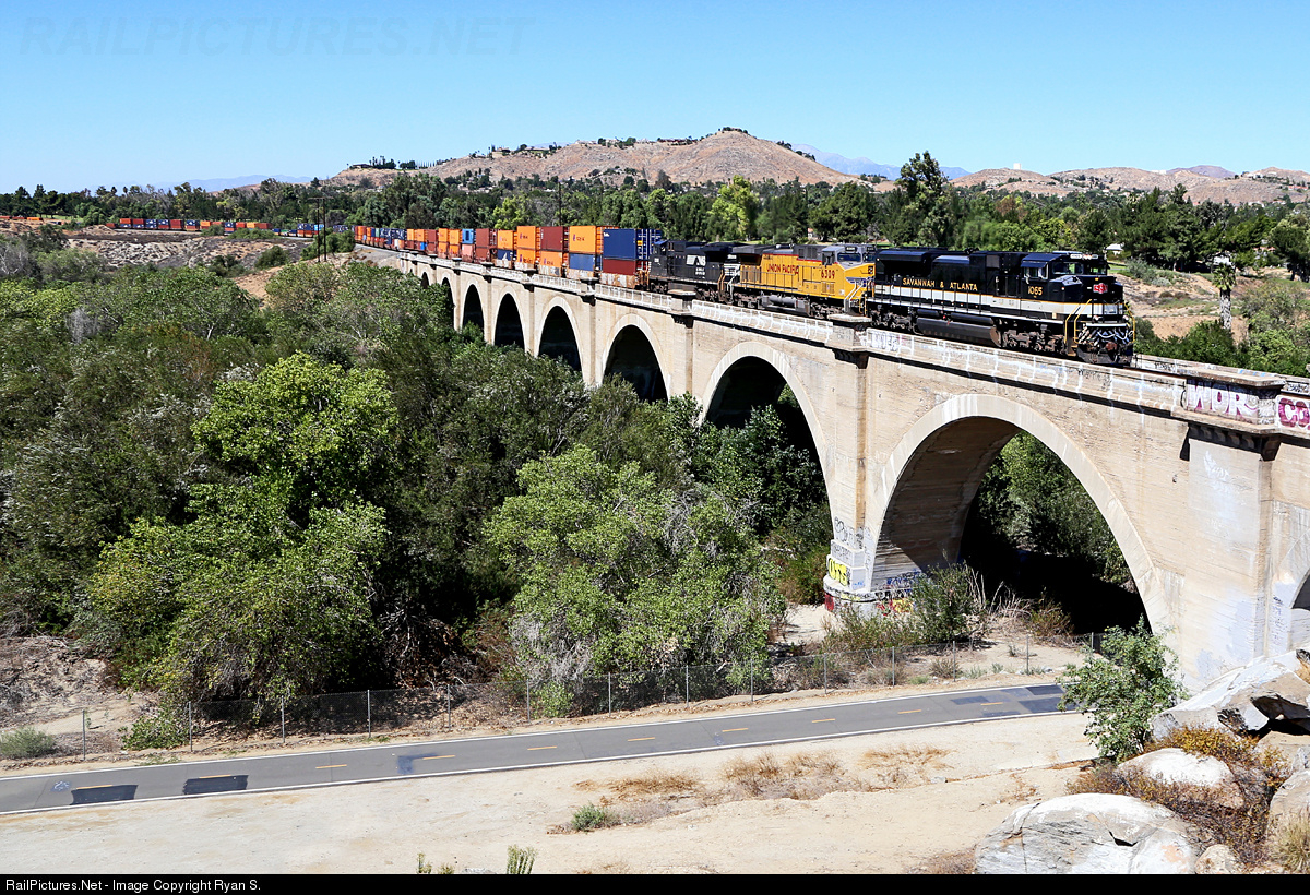 Completed in 1904 by the San Pedro, Los Angeles, and Salt Lake Railway the cement arch bridge spanning the Santa Ana River continues to serve the line's successor, Union Pacific, well over 100 years after first opening to commerce. On a sunny afternoon an eastbound stack train bound for interchange with the Norfolk Southern sails across the impressive 984' trestle near Riverside, CA. Leading the eastbound stacks is one of Norfolk Southern's 20 'heritage' painted locomotives, in this case NS SD70ACe 1065 wearing colors reminiscent of the Savanna & Atlanta Railroad.