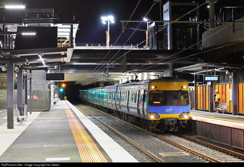 A Frankston bound Metro service arrives at the recently grade separated station at Ormond.