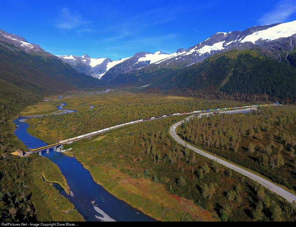 A 7200 ft long train of mixed manifest and containers off the barge in Whittier is on the move to Anchorage behind consecutively numbered MACs. The heavy train completely fills the spectacular glacier ringed Bear Valley. To the right of the frame the train is still exiting the 2.5 mile long Anton Anderson Memorial Tunnel while on the left the head end is crossing Placer Creek and is about to duck into the south portal of the 1 mile long Portage Tunnel on the ARR's Whittier Branch.