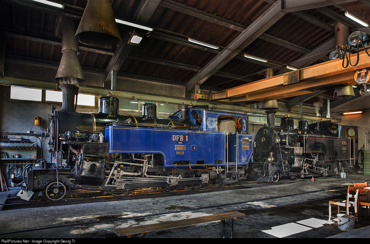 Cogwheel steamlocomotives of the Dampfbahn Furka Bergstrecke (DFB) under steam in the shed of Realp, ready for pulling special trains in the afternoon. On the left HG 3/4 # 1 from 1913, brought back from Vietnam in 1990 and operational again since 1993. On the right HG 3/4 # 4 from 1913, running for the Furka-Oberalp Bahn (FO) till 1972. Since 2006 operational again and donated to the DFB from the Matterhorn-Gotthard Bahn (MGB) in 2010.