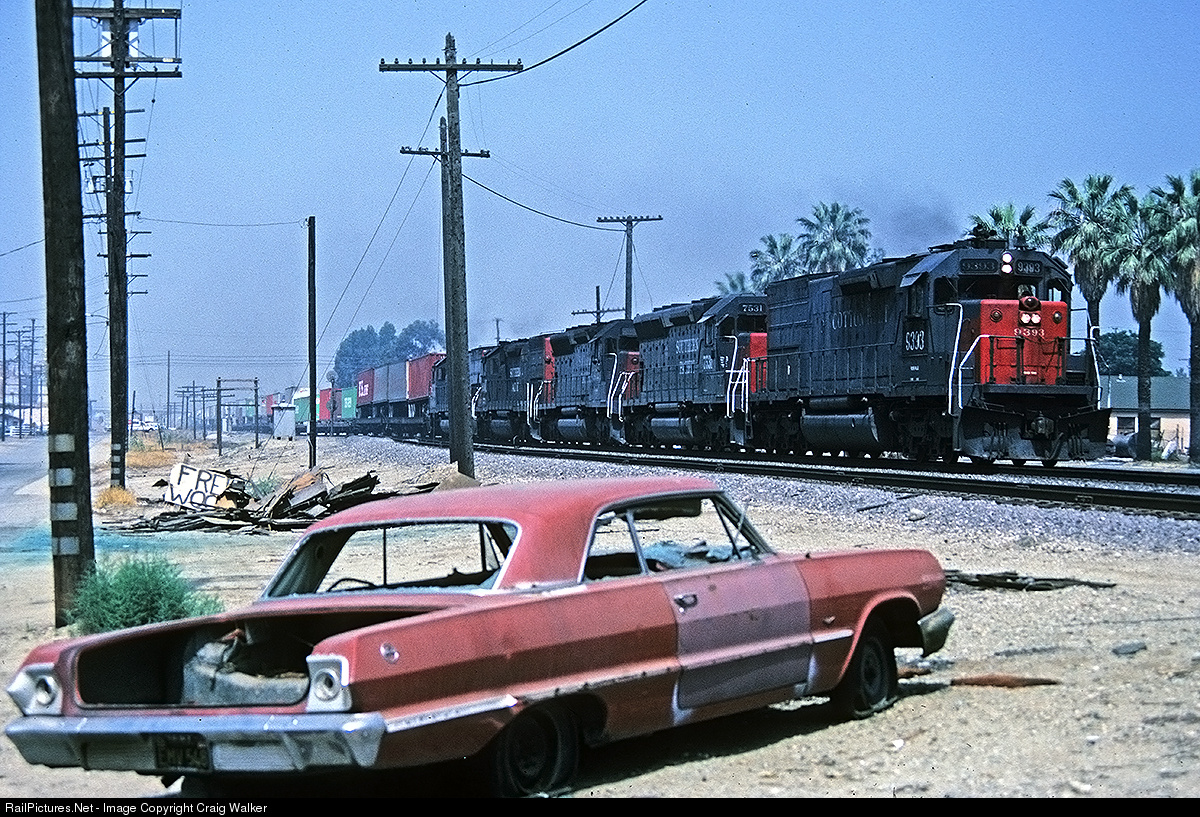When many railfans think of the Southern Pacific, they think of dirty, run-down locomotives. But this was generally not the case with the SP - not until after the failed Southern Pacific Santa Fe merger, at least. But, the mighty SP did have a lot of trackage that passed through scenic areas, such as Donner Pass, the crossing of the Tehachapi Mountains, Oregon's Siskyous, the Coast Line along the Pacific Ocean, or places such as Ontario, California. Cotton Belt SD45T-2 9393 leads an eastbound intermodal train through the typically delightful scenery found in southern California's "Inland Empire" on June 13, 1985. (I am happy to report, however, that many of this places have been cleaned up since this photograph was taken! Sadly, though, part of that clean-up included line-side fencing and the elimination of many grade crossings, making photography more difficult.)