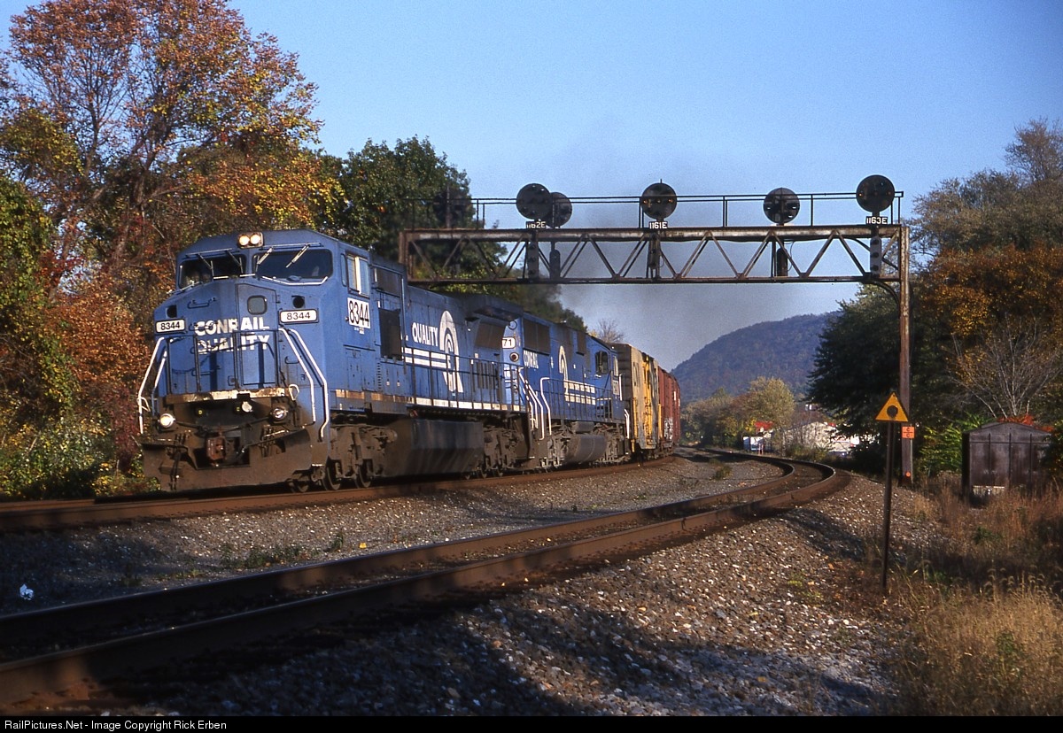 Cruising out the old Middle Division on a late autumn afternoon, NS 8344 (formerly CR 6102) leads a westbound manifest. The once familiar signal bridge here is, of course, long gone.