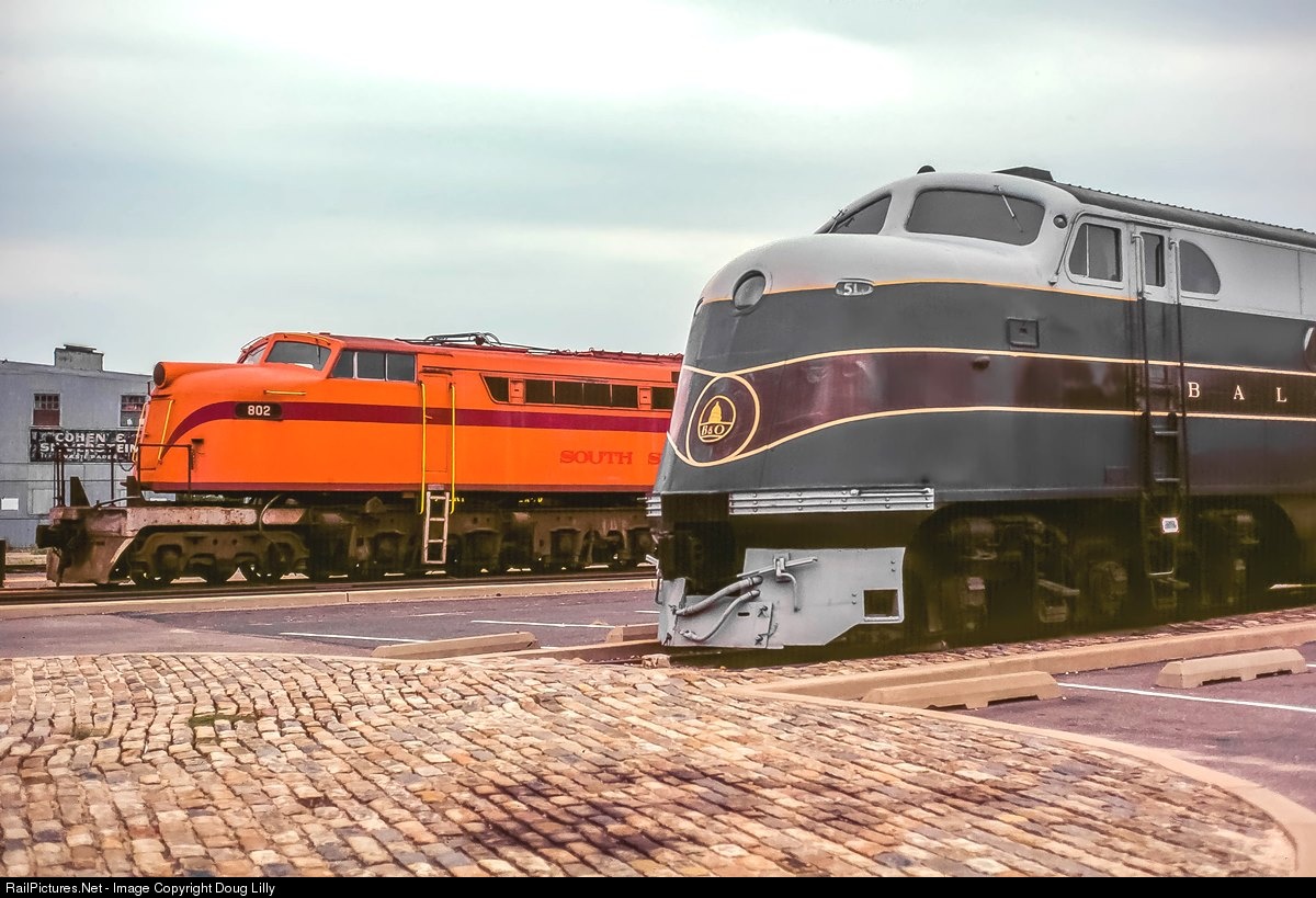 America’s first streamlined passenger diesel, Baltimore & Ohio’s 1937 EMC EA 51, has been in the B&O museum for twenty-seven years in this 1981 view. Beyond the 51 is Chicago South Shore & South Bend’s GE 2-D+D-2 electric 802, recently retired and sent to the museum. It’s possible that between the time that the 802 was manufactured in 1946 and the 51 was retired in 1954, the two have encountered each other. This would have occurred in northern Indiana or East Chicago as the streamlined Capitol Limited rolled past South Shore interchange points where the big GE was working. Now stable mates at the museum, this partnership would end in the mid 1990’s, when the 802 was acquired by the Lake Shore Railway Museum.