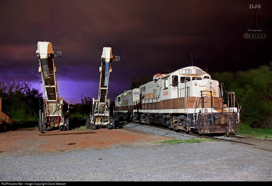 | Grainbelt/Farmrail GP10 8180 and GP20 4079, EMD veterans stand in Weatherford, Oklahoma minutes before a torrential thunderstorm grips the area bringing record amounts of precipitation to the region. |