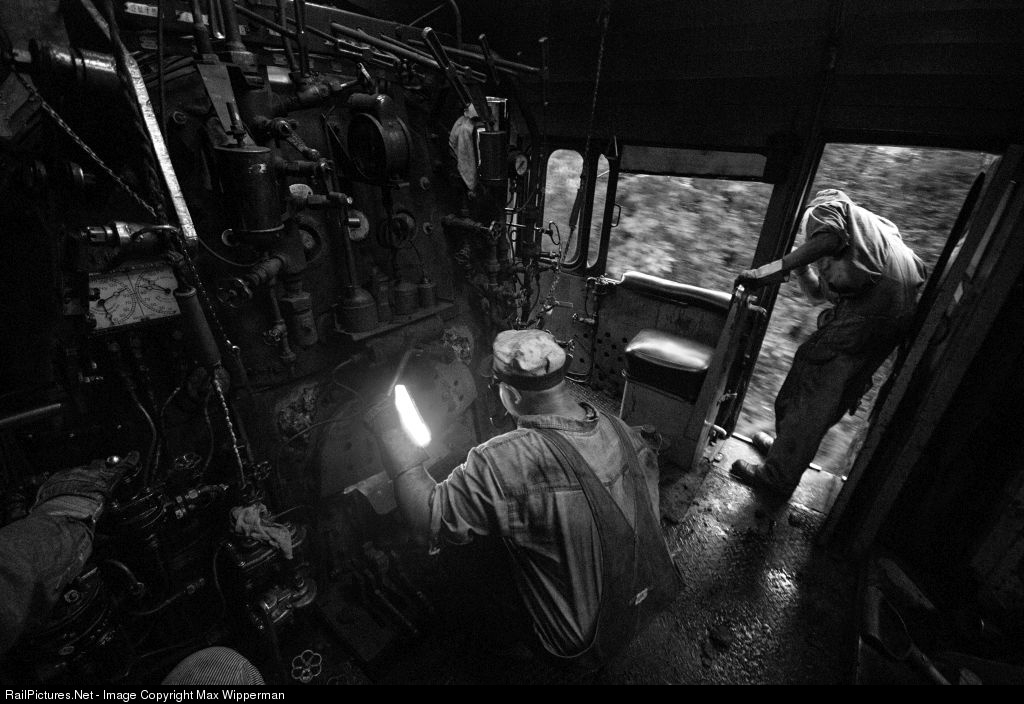 As the engineer has his grip on the throttle, Fireman J.W. Magee checks his fire prior to attacking the 1.0% grade with a 12 car train as his student keeps an eye ahead, assisting the engineer with vision around curves. Taken by an off duty railroad employee.