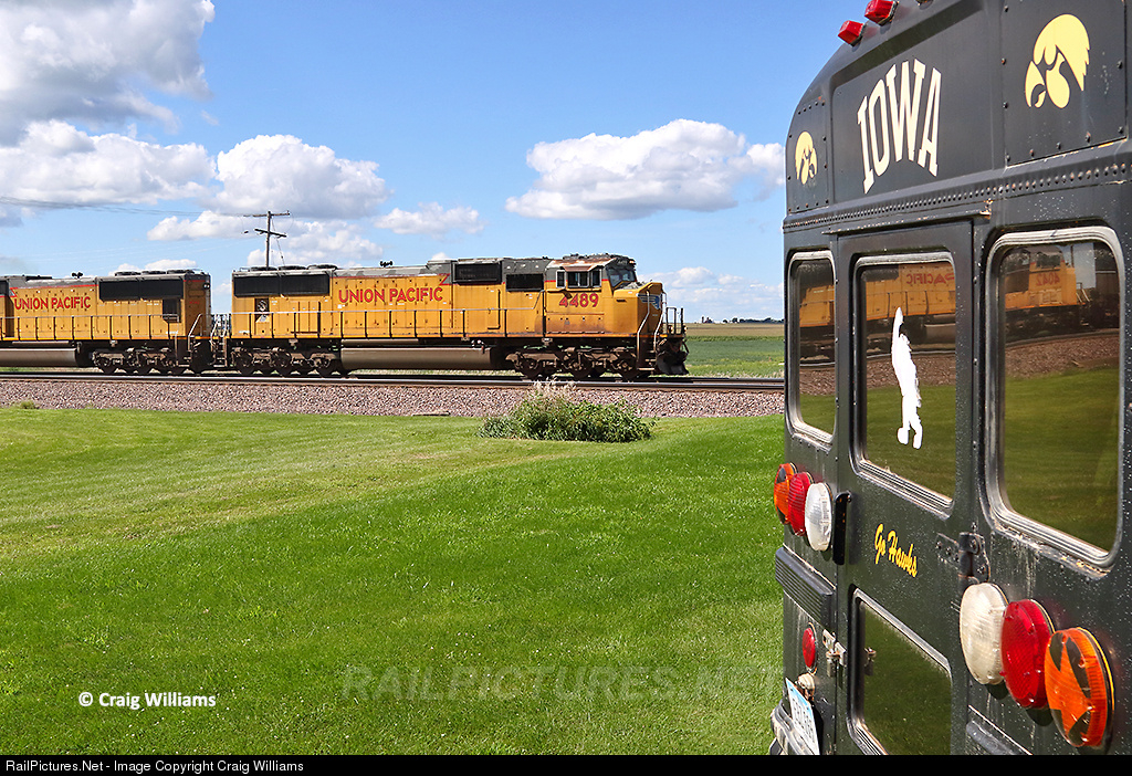 | It is that time of the year. When all kind of Iowa fans get their gear and vehicles out for game days at Iowa City. Here an eastbound hotshot passes by a proud Iowa bus at Clarence. This bus is also for rent for party or whatever on non-game days. |