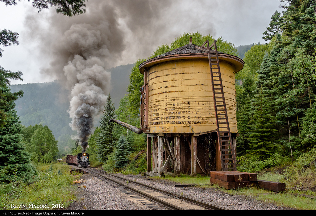 The D&RGW, and later, the Cumbres & Toltec Scenic Railroad have maintained a wooden water tank at this location since 1893. Located about 4.5 miles and 900 vertical feet from the summit of Cumbres Pass, the small, Consolidation-type engines from the early years of the line always needed water here and 315 is no exception. With the arrival of the larger, superheated Mikados in the 1920s, this tank was less important, although still present as an emergency supply of water. The K-36s of the present-day Cumbres & Toltec Scenic Railroad seldom stop here, taking water at the standpipe on Cumbres Pass instead.