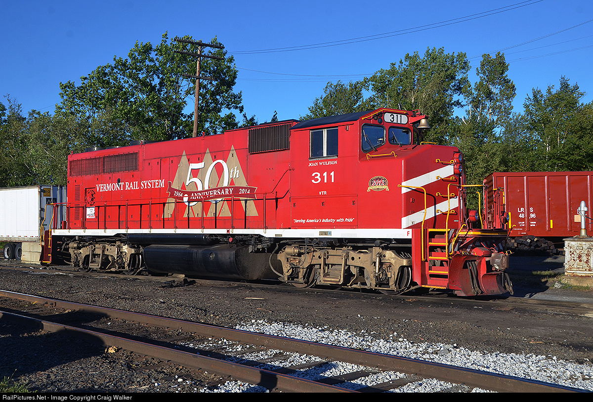 Vermont Railway GP40-2 311, wearing a special scheme to commemorate the railroad's 50th Anniversary in 2014, sits in the late afternoon sun at White River Junction, Vermont, following the town's 2016 - 24th Annual - Glory Days of the Railroad Festival. Because of the "wide nose" Canadian safety cab, railfans have dubbed these engines as model GP40-2(W), although that is not what EMD/GMD called them - but it is handy for differentiating them from a "normal" GP40-2. Built in April 1976 as Canadian National 9662, this engine was later sold to Helm Leasing before being sold to the Vermont Railroad. The engine carries the name "Joan Wulfson," wife of one of Vermont Railway's founders, Jay Wulfson, and the mother of VRS President David Wulfson.
