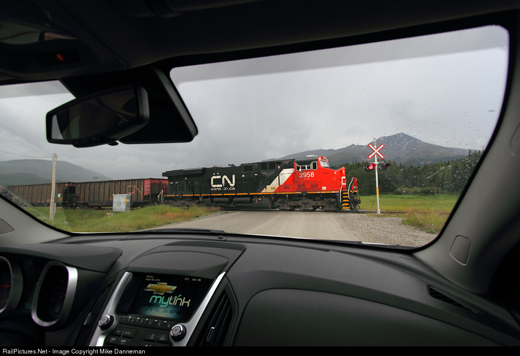 The DPU of a loaded Canadian National coal train crosses Street 50 (Range Road 234A) grade crossing at Cadomin, Alberta, and heads eastbound on CN’s Mountain Park Subdivision on August 8, 2016. This is the third section (50 cars) of a 150-car train that loaded at Luscar Mine loadout and will head up to Bickerdike on the Foothills Subdivision to combine with the loaded portion waiting there. The train will then head west on the CN main line for eventual export.