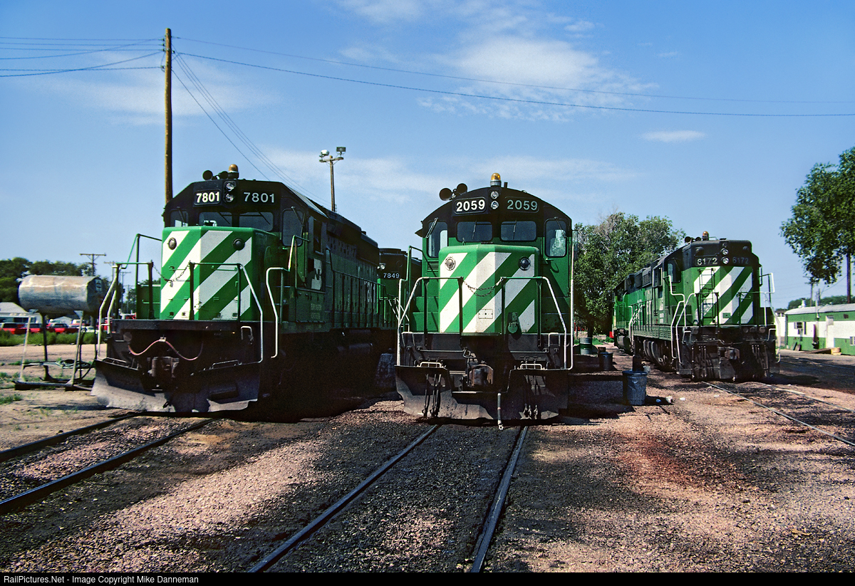 It’s an all-EMD Burlington Northern line up at Sterling, Colorado, on July 7, 1985. Flanking GP20 No. 2059 are SD40-2 No. 7801 and SD9 No. 6172.