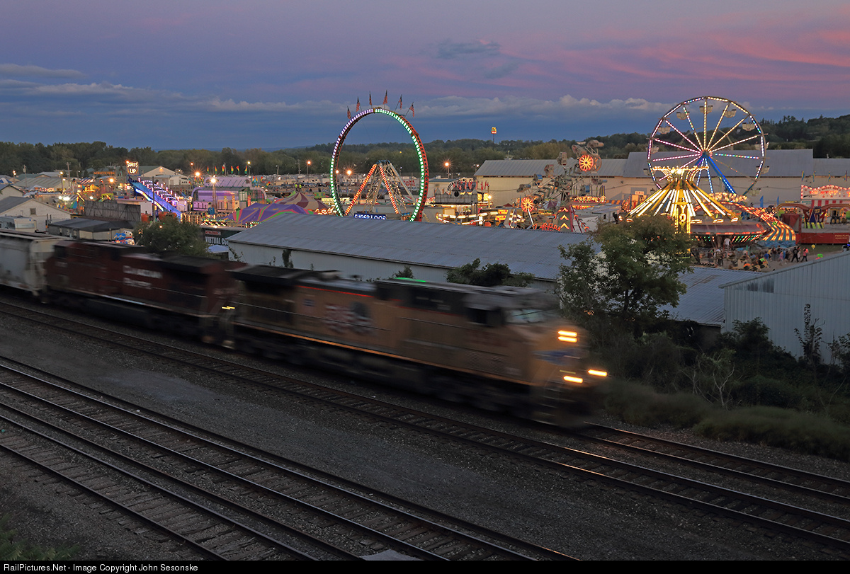 | Fair Time. Late Summer is county fair time in Upstate NY. The 175th Fonda Fair is in full swing as an empty CSX ethanol train rolls WB past the fairgrounds as the fair comes alive with bright lights at dusk. The Fonda Fair grounds are located between the CSX Mohawk Sub and the Mohawk River. The river is located just in front of the distant McDonalds sign and beyond that is the NYS Thruway (I-90). |
