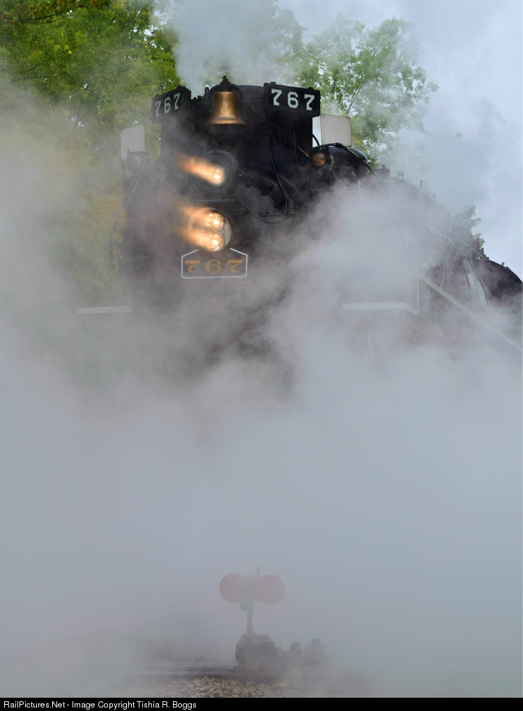 | In a light rain, NKP 765 dressed as 767 shoves back out of Fitzwater Maintenance Yard in Independence, Ohio to prepare to load the day's first passengers for a journey along the Cuyahoga Valley Scenic Railroad. |
