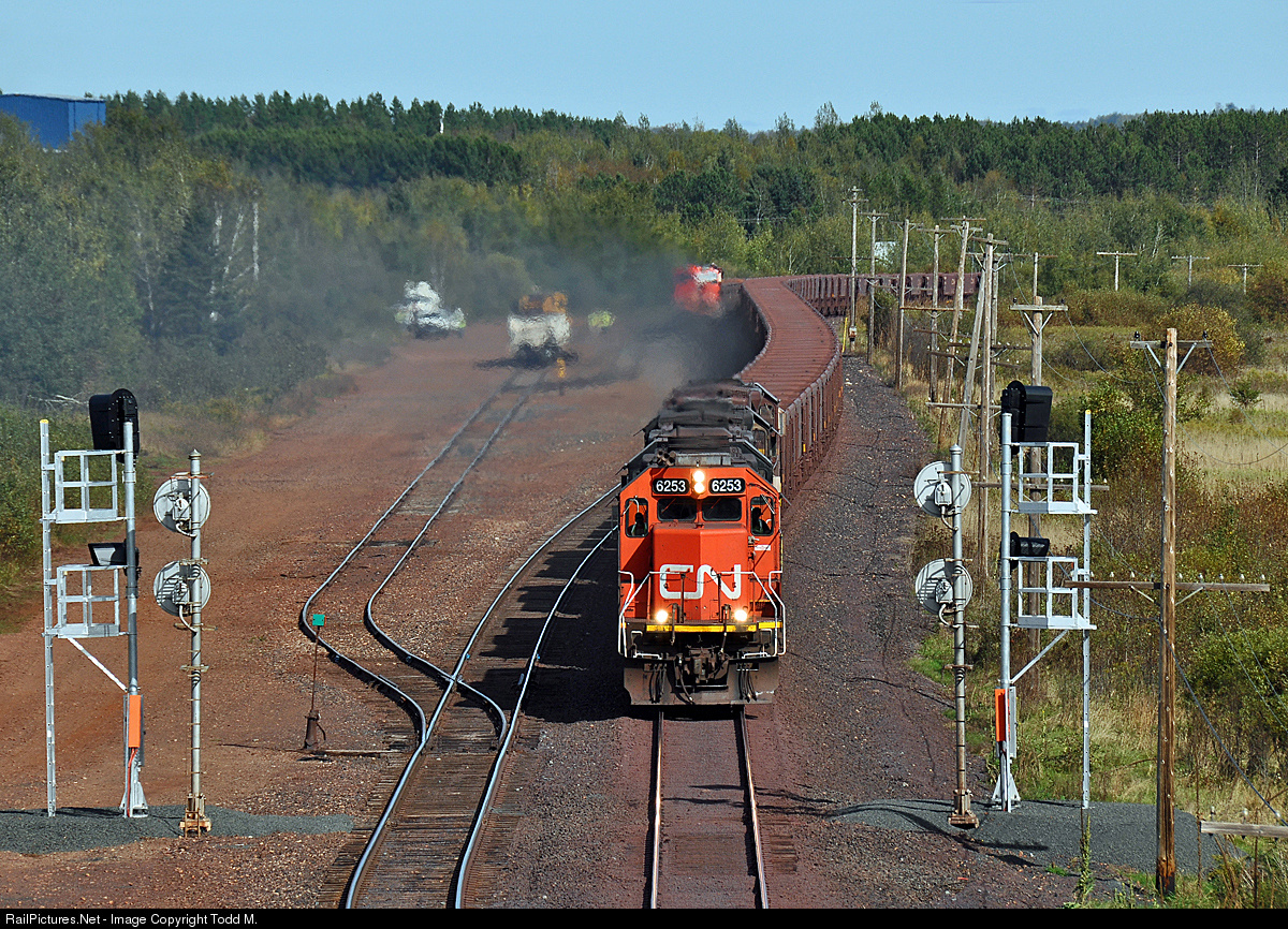 | A quartet of EMD's led by IC 6253 throttle up and blow past a stranded BFT rock train which was being led by CN 2138. The nb CN 2138 had a fuel line come off and spray fuel causing a situation requiring CN mechanical and Biwabik emergency responders to arrive on scene. Also of note are the new signals being installed at Biwabik thus making any searchlight signals even more rare across the former Missabe |