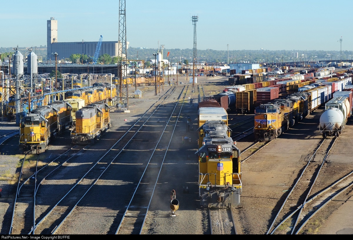 | UP 1826 (SD40N) sands the track for traction as it sorts cars in the North Yard. Meanwhile a quartet of heavies has just brought a new string of freight into the yard and will soon detach and head to the fueling station. |