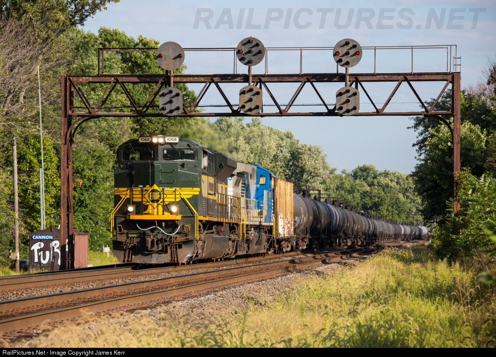 Loaded ethanol train 64K passes under the soon to be replaced signal bridge at CP CANNON on NS' Pittsburgh Line. Todays version of the 64K has the Erie Heritage unit followed by one of the new AC44C6M units, NS 4000..