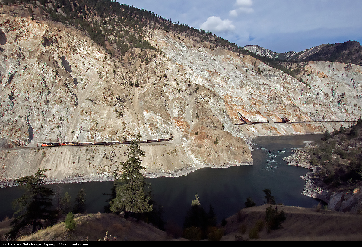 A Canadian National sulphur train threads its way westbound through the Lasha sheds on CN's scenic Ashcroft Sub.