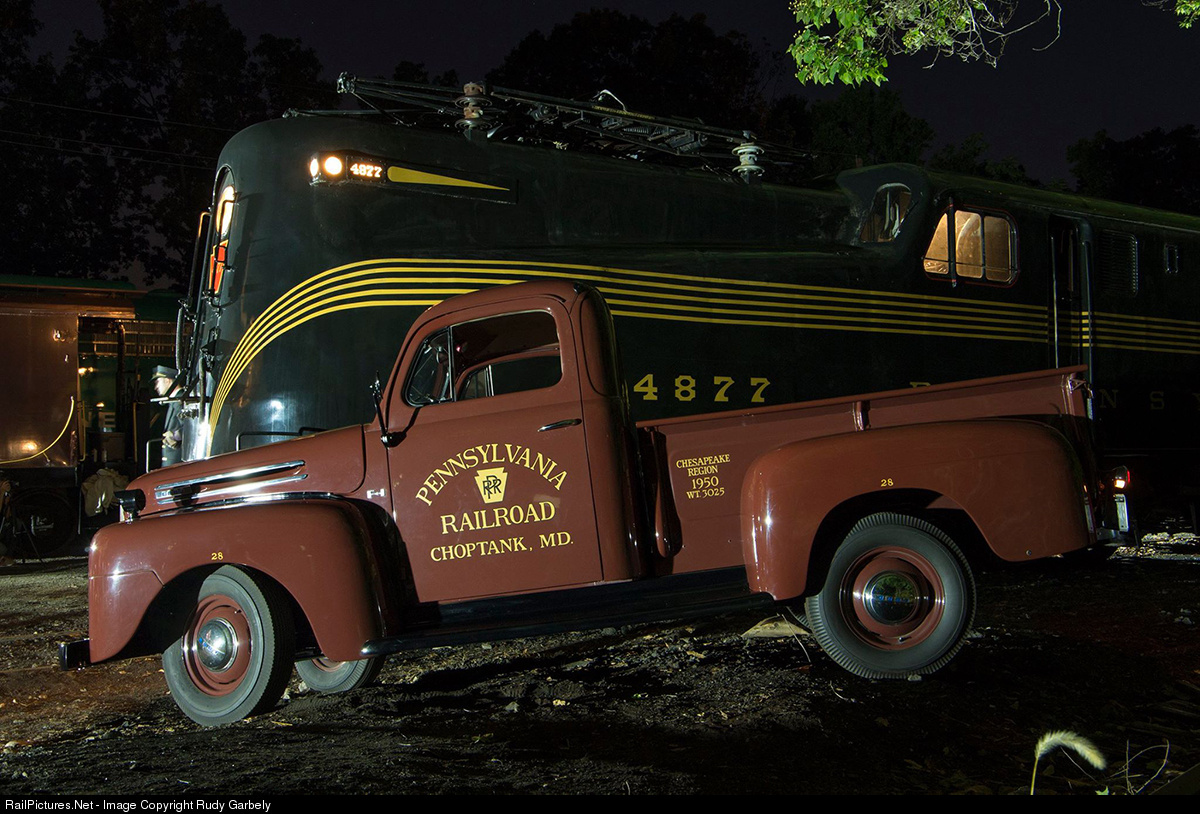 A venerable Pennsylvania Railroad GG1 glides silently past a PRR Maintenance-of-Way truck as it pulls into the yard. Actually, truck owner Ken Briers graciously drove this 1950 Ford F-1 up to Boonton, NJ from Choptank, MD to participate in Museum [for a day], the United Railroad Historical Society of New Jersey's annual event where the public is welcomed into the otherwise private restoration yard to view New Jersey's collection of historic rail equipment. The event is customarily preceeded by an intimate night photo shoot. For more information on the September 25, 2016 event, visit www.museumforaday.com.