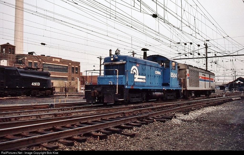 An EMD SW1 has removed the HEP (head-end power) car from the Broadway Limited and is preparing to position it for the next morning's eastbound run, to be pulled by GG-1 No. 4913, at the left of the photo. Built in August, 1950 as PRR 9404, the 8564 will end its days on the Tyburn RR, a short line in Morrisville, PA.
