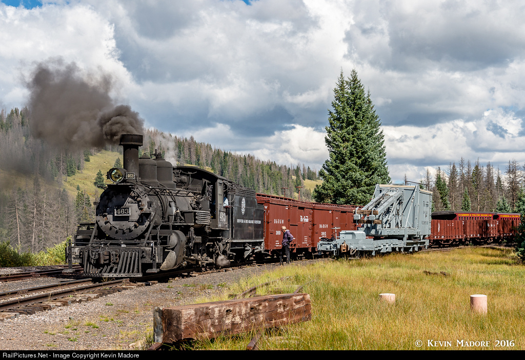 Pinning on the power. A D&RGW K-27 Locomotive couples up to a freight consist in the yard at Cumbres Pass, in preparation for the trip down the 4% grade to Chama, NM and beyond. On the siding next to the freight is D&RGW Pile Driver OB, which was active this day near the tail of the Cumbres Pass Wye.
