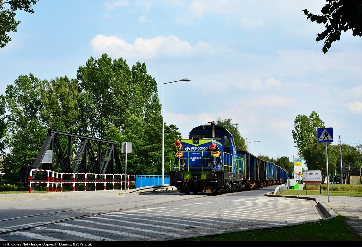 | Diesel locomotive SM42 modernized in Pesa Bydgoszcz with coal cars are going on the bridge which can be used by trains and automobiles. A bridge in the picture was built in 2014. A bridge stands on the pillars of the old bridge, built in 1907, in which one of the spans have been preserved and we can see it in the picture on the left part of photo. |