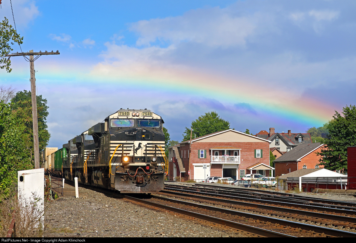 | NS 21E races under a rainbow as it approaches the Amtrak Station in Latrobe, PA. I'm told that this rainbow appeared in the sky around the same time that golfing legend and Latrobe native Arnold Palmer's ashes were spread across the fields of the local country club. |