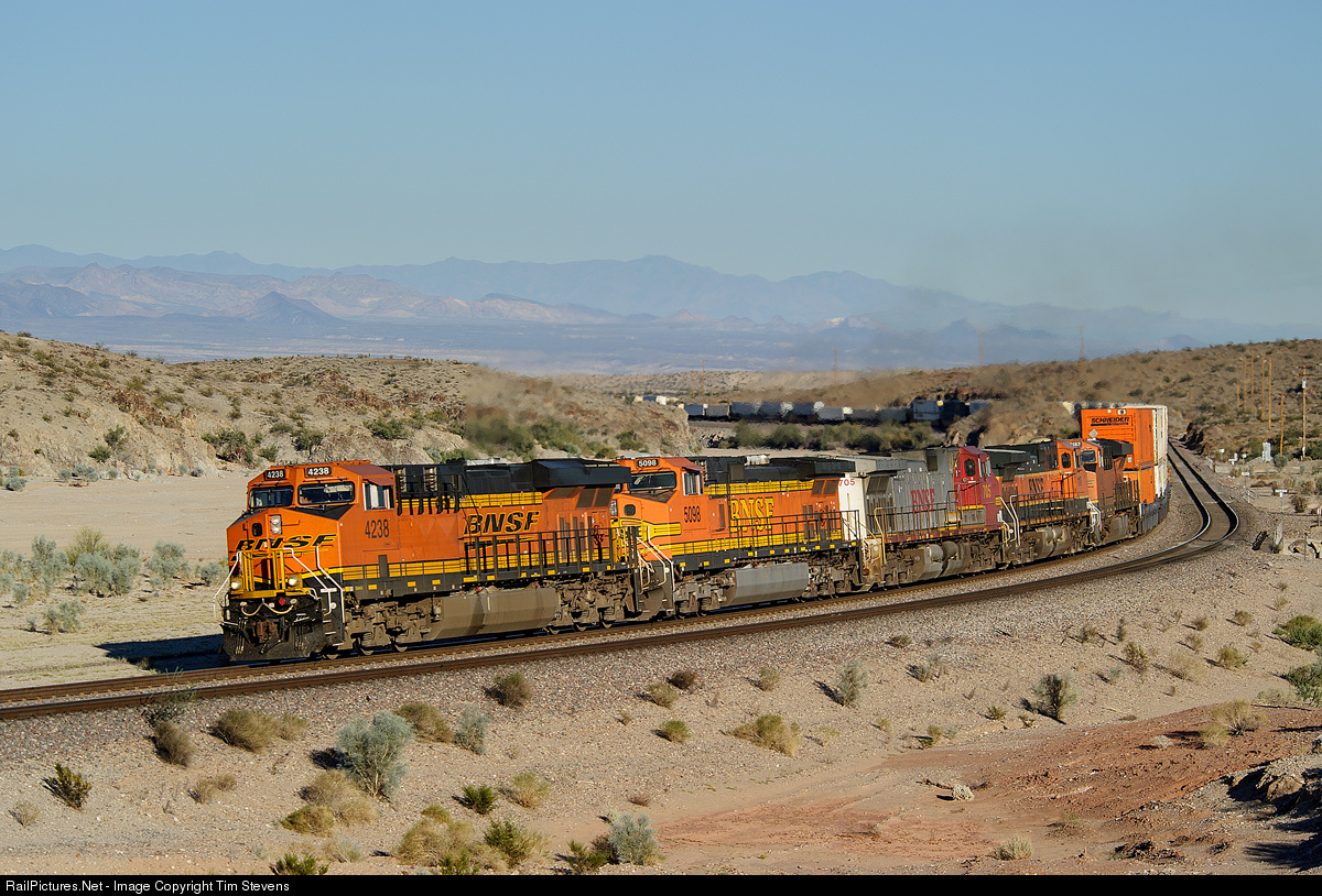 | This is about as interesting as it gets on the Transcon these days! BNSF ES44C4 4238 (H3), BNSF C44-9W 5098 (H2), BNSF C44-9W 705 (Warbonnet), BNSF C44-9W 1117 (H1) and BNSF ES44C4 8187 (H3) climb out of Needles with a San Fran Z train in tow. Any paint schemes that BNSF has applied to their 6 axle GEs missing? |