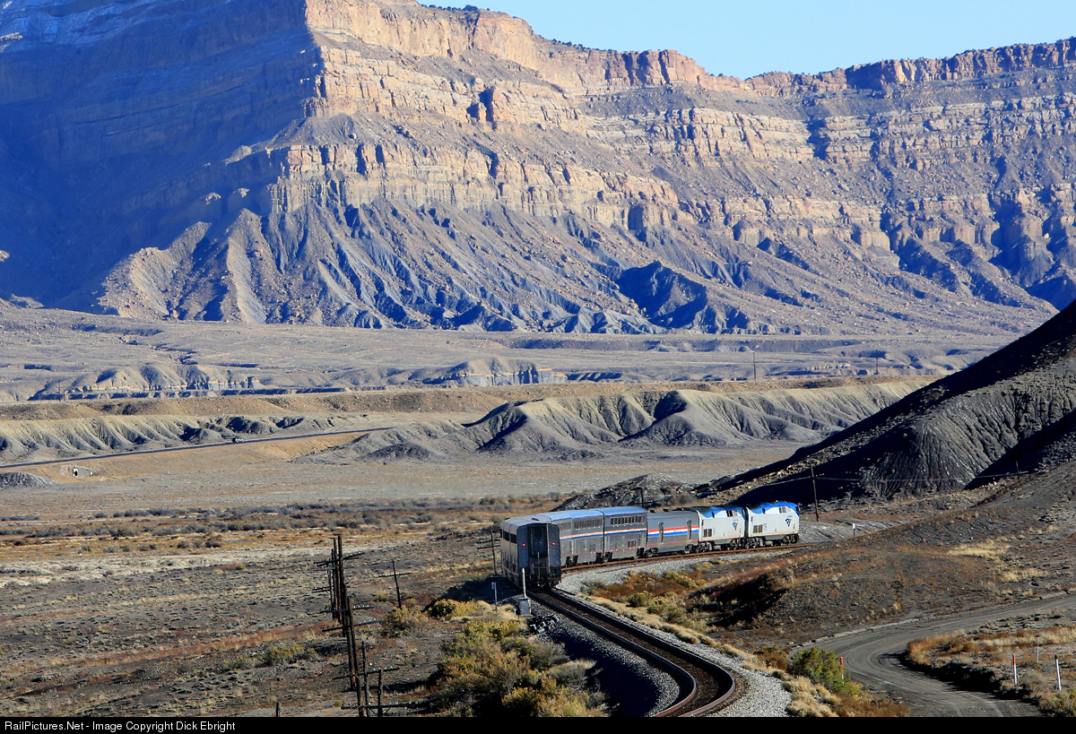 | A 7 hour late Amtrak #6 is running along the base of Utah's imposing Book Cliffs. This ex. D&RGW trackage follows these cliffs for 200 miles from Helper, Utah to Palisade, Colorado. It's the longest continuous escarpment in the world. Next stop is Green River, Utah in 32 miles. |