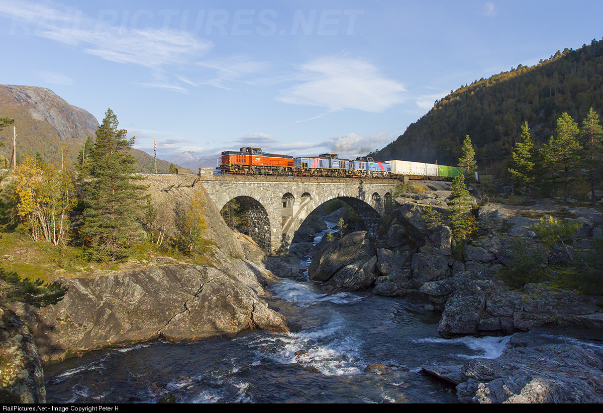 Only minutes after sunrise at this place three T44 diesel locomotives from Green Cargo cross the Stuguflåtenbru with an intermodal train from Åndalsnes. Up to here the three locomotives have fighted hard to get from sea level up to ~550m height. The fight will continues as there are another 100m to climb for reaching the station of Dombås where the Rauma line connects to the electrified Dovre line and the journey of the train continues then behind of a electrified unit.