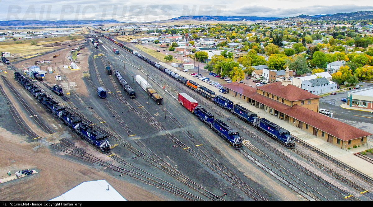 Drone Shot - Helena yard full of Montana Rail Link power, BNSF train pulls up to the depot with MRL SD40-2's that paying back horsepower hours to BNSF as the local works the yard and the Helper power parked ready for the afternoon rush