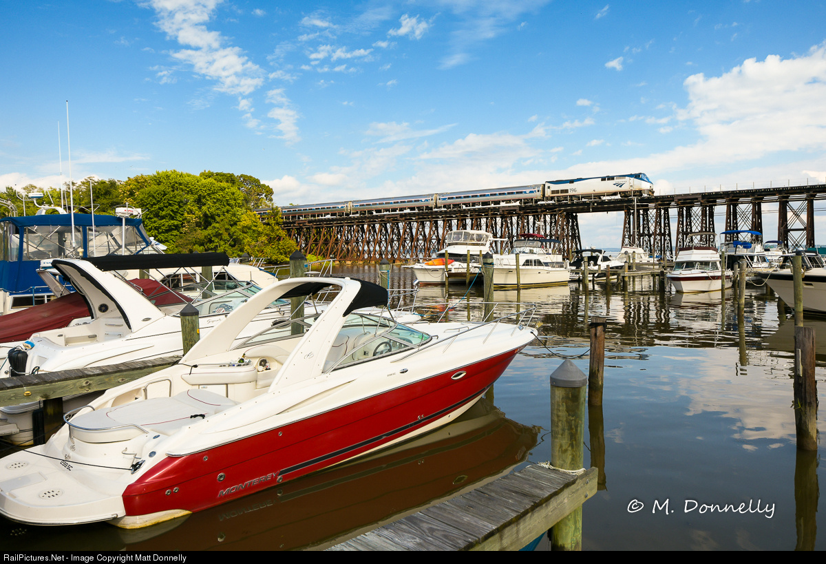 A Northeast Regional makes its way southbound past the marina at Neabsco Creek.