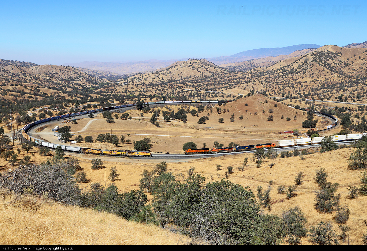 | Meet me at Walonger… Lumbering up the western slope of the Tehachapi Pass a lumber heavy QRVWCB circles the famous Tehachapi Loop at Walong moments from meeting BNSF's westbound Z WSPNBY. Work to link the siding at Walong (4800') with the siding at Marcel (6189') began in 2015 and after a year of work the new stretch of double track railroad has recently been placed in service. While the relatively short sidings at Walong and Marcel were once a match for trains plying the rails over the Tehachapis the size of many of the trains regularly running the mountain today, including both those pictured, rendered them moot and taking away siding space between the end of double track at Cable and the 8960' siding at Woodford. While the new stretch of double track has changed the landscape on Tehachapi is has brought with it a new efficiency that will keep trains moving smoothly over one of American's most fabled railroad routes. |
