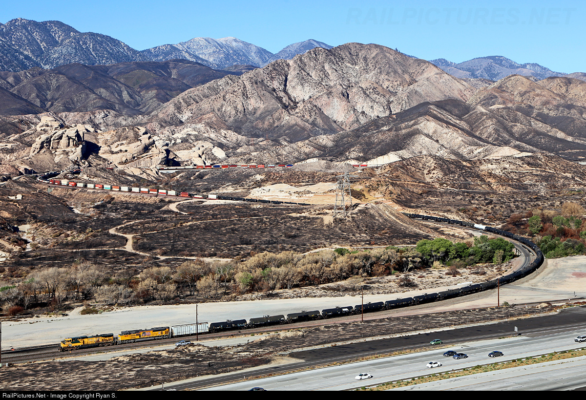 As an eastbound BNSF stack train goes up a westbound unit tank train comes down into 'old Cajon'. This location, once Cajon Station, is where the north and south tracks split with the original 3% grade 'south track' following the original 1885 laid route (bottom right) to the summit while the 'north track' added in 1913 followed a different and lengthier course, trading distance for an easier 2.2% grade. The new third main track, added nearly a decade ago, followed the course of the north track as demonstrated here by the east-west meet at Sullivan's Curve. UP 6706 on the point of the tanks started life as C&NW 8804 and still proudly wears its as delivered green & yellow C&NW livery.