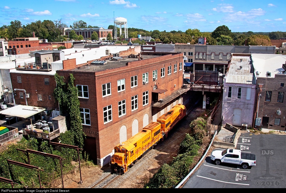 | Pickens Railroad U18Bs 9504 and 9500 step through downtown Anderson, South Carolina with the "Anderson Job" as the crew prepares to pick up their Gluck bound cars from the NS interchange on the western edge of town. |