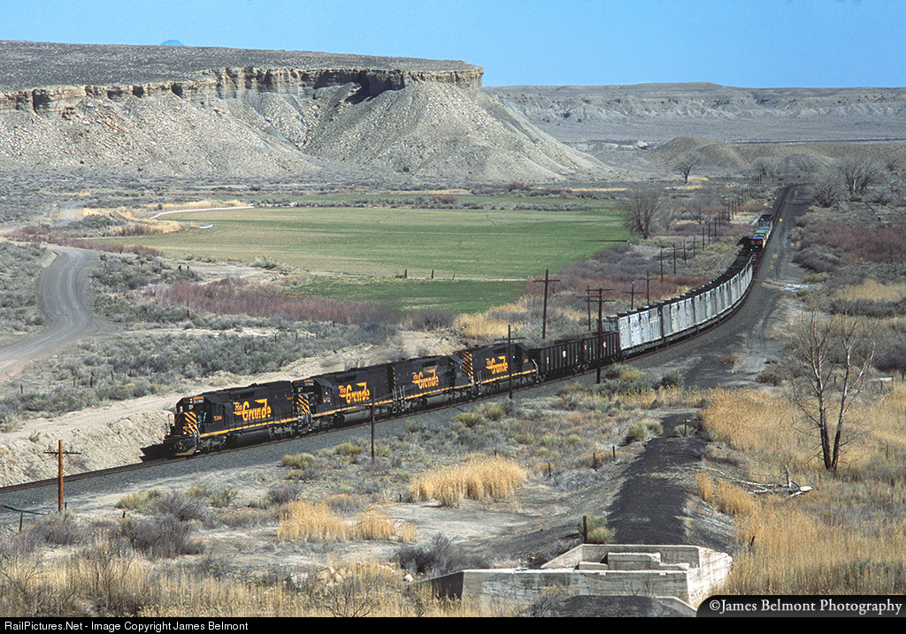 With the Rio Grande 'Gang of Four' on the point, UP's LJP45 local rolls through D&RGW's 1945 'Farnham Line Change' east of Wellington on April 11, 2003. The track realignment required a new crossing of the Price River and it eliminated a sharp curve at the east end of Wash siding. On the point are D&RGW SD40T-2s No. 5390, 5354, 5371 and 5349 pulling 22 cars from ECDC at Columbia Junction west to Helper yard.