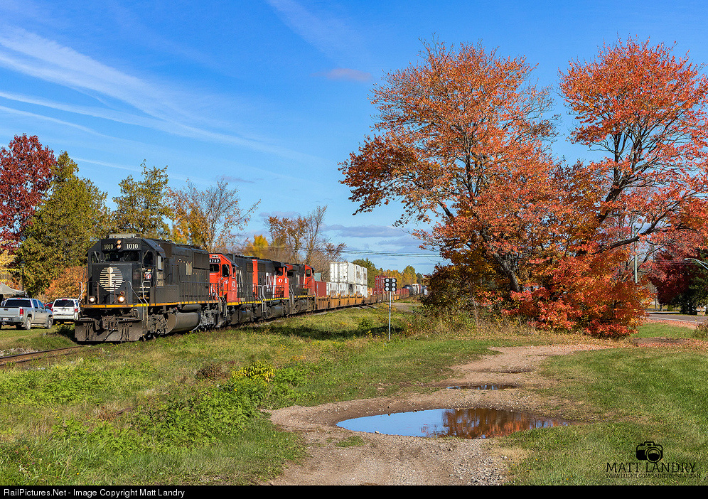 | RED & BLACK, MY TWO FAVORITE COLORS. IC 1010 leads westbound train 406, as they rumbles by the Fall colors at Petitcodiac, New Brunswick. |