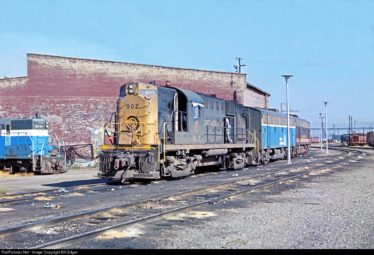 NP 907, an Alco RS-11, gets a look under the hood by a mechanic at Burlington Northern's X-GN roundhouse in Superior, WI. Former GN passenger GP9 no. 679 looks on, and symmetry is kept by a pair of EMD B units, one blue, one black. At this point BN had not completed renumbering their locomotive roster, but the power mix is a definite give away that the merger has occurred.
