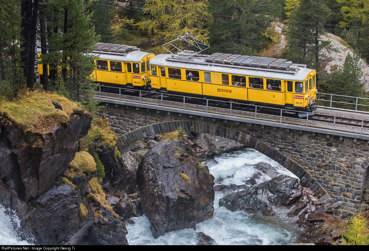 | Electric railcars ABe 4/4 # 34 and # 30 of the former Berninabahn (Bernina Railway) are crossing the Ova da Bernina creek above Morteratsch on a grade of 7.0 %. The train circulated as MONTEBELLO EXPRESS on the occasion of 20 years "Club 1889" from Pontresina to Ospizio Bernina. |