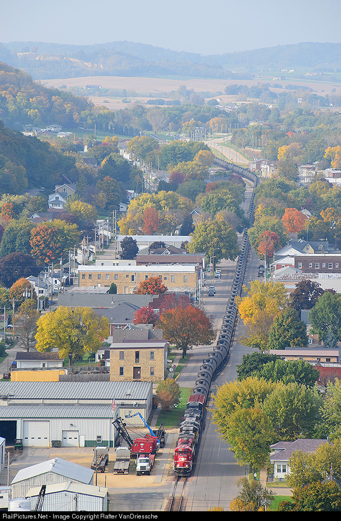| With fall colors in full swing, CP 5047 makes its way through downtown Bellevue, Iowa. |