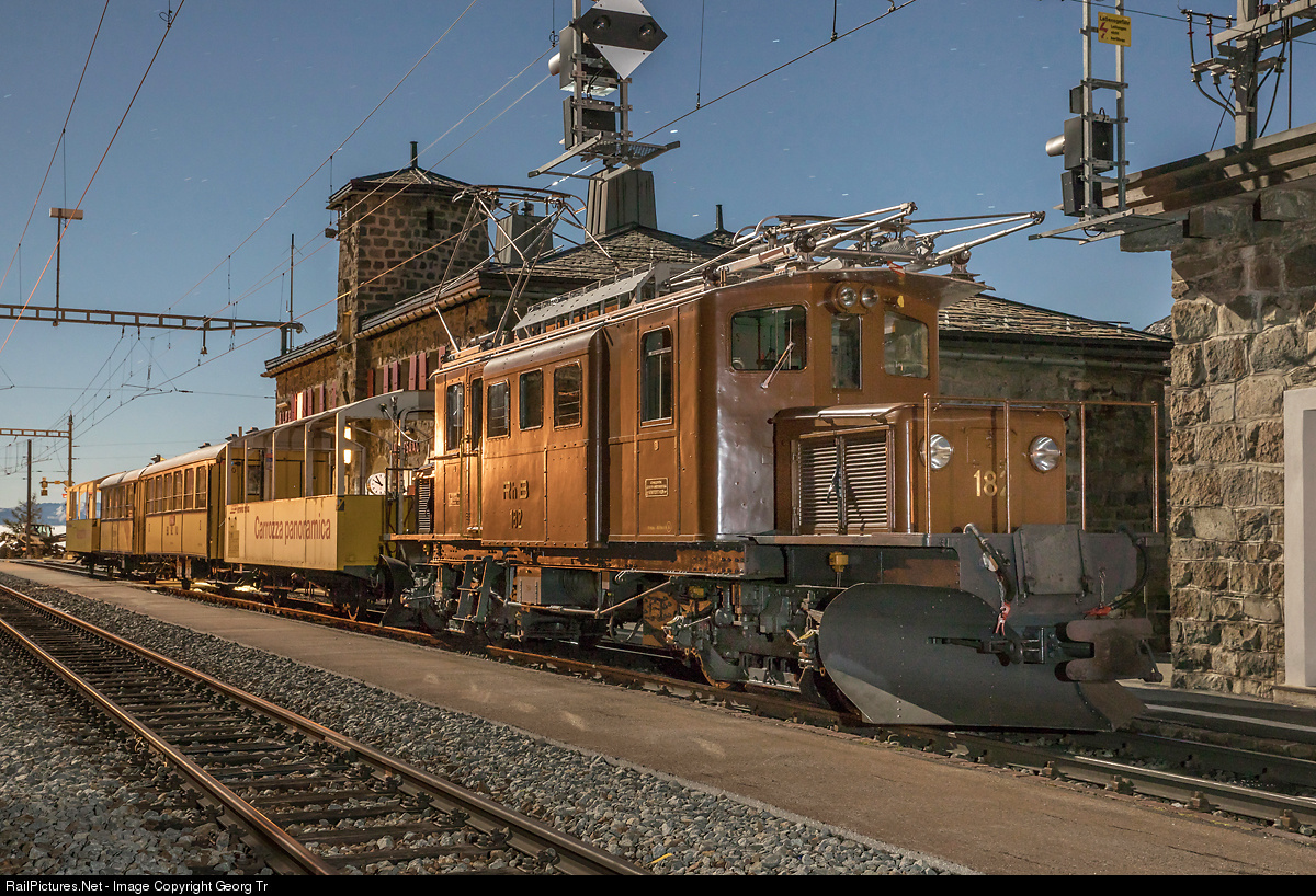 The clock at the station building of Alp Grüm shows five minutes to 10 PM. Under the stars of the night sky the special train of the Rhaetian Railway with the "Bernina Crocodile" Ge 4/4 # 182 and open observation cars, is standing on track one for the return trip to Pontresina and St.Moritz, illuminated by the full moon. The passengers are enjoying the famous glacier fondue, a speciality made of hot swiss cheese in the station restaurant.