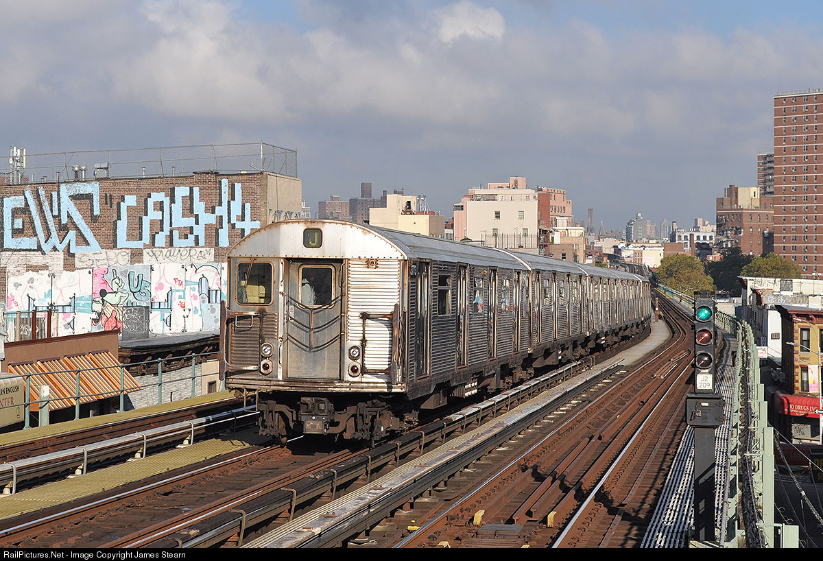 An express J train bound for Broad Street takes the middle track through Flushing Avenue with a morning commuter service. The Broadway Elevated section features three tracks, one in each direction for local services and a third which runs express towards Manhattan in the morning and away again in the evening.